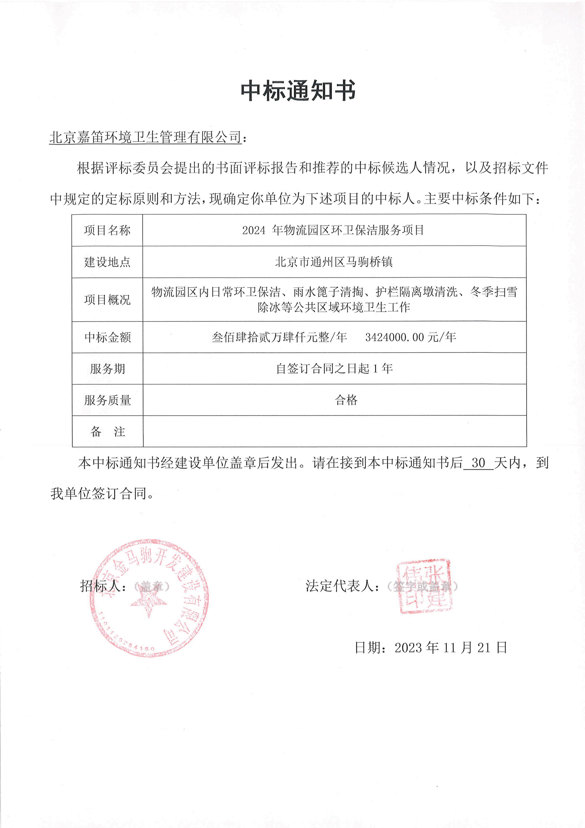 近日,北京嘉笛环境卫生管理部在管理层的带领下,凝心聚力、乘势而上,谱写市场新篇章,中标2024年物流园区环卫保洁服务项目。